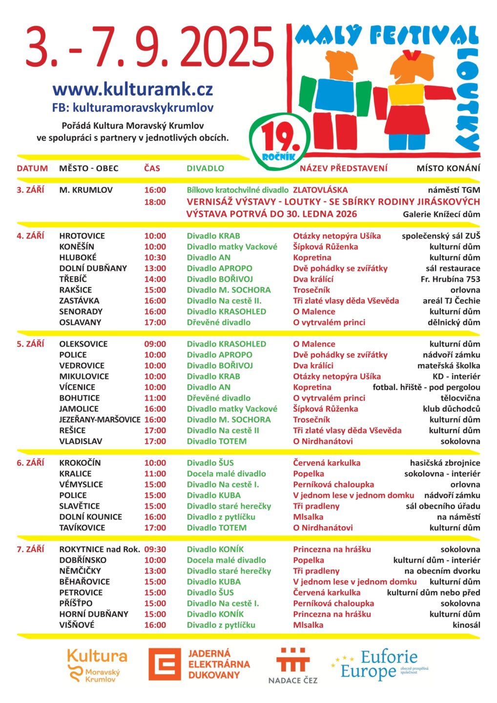 Ve středu 3. 9. otevře festival Zlatovláska v podání Bílkova kratochvilného divadla (16:00, náměstí TGM, Moravský Krumlov). Večer od 18:00 následuje vernisáž výstavy „Loutky – ze sbírky rodiny Jiráskových“ v Galerii Knížecí dům. Výstava potrvá až do 30. ledna 2026.